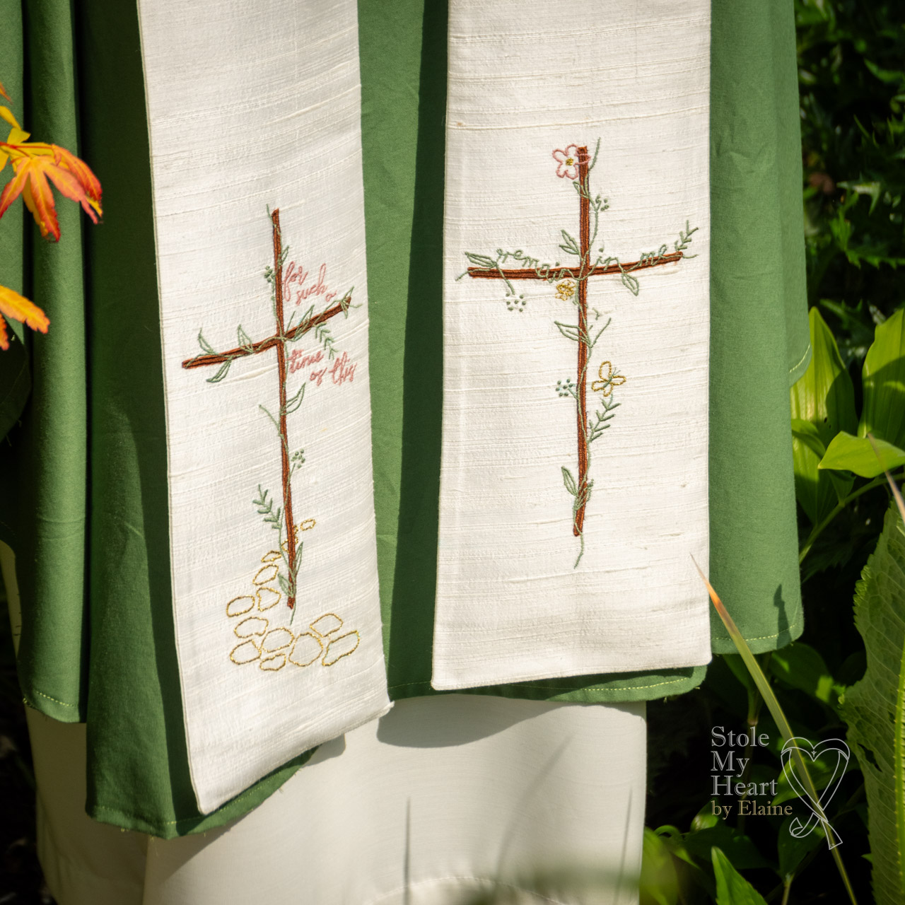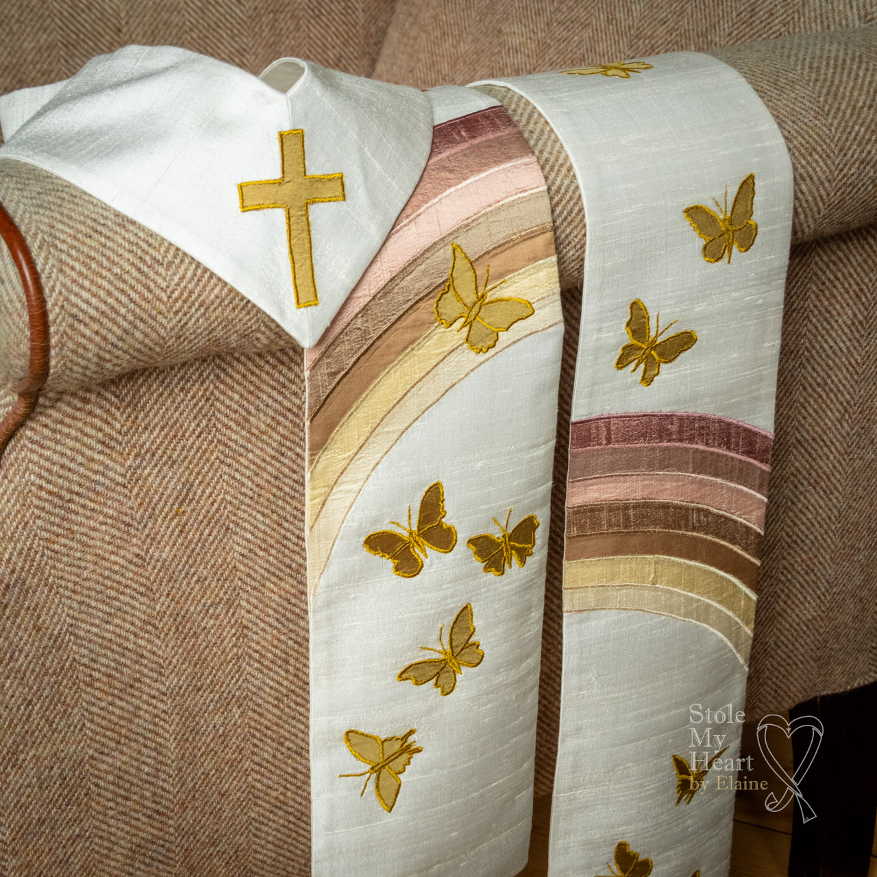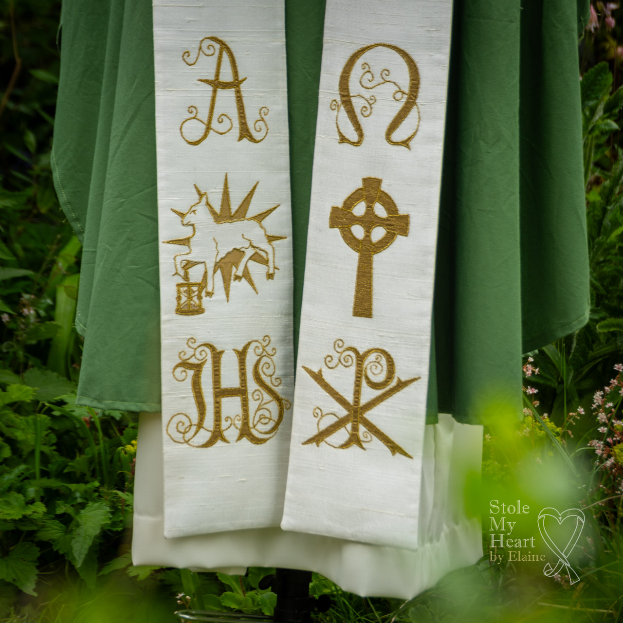 All of my stoles, vestments and church textiles are designed, cut out by hand & embroidered on my trusty Bernina sewing machine, or by hand, using the finest silks and cottons. I design each piece to incorporate the symbols and religious iconography of your choosing. I love the process of talking through ideas & trying to create something new and exciting, that fulfills your vision and is totally unique. From everyday stoles to intricate one off designs for special occasions, such as ordinations, leaving gifts, I’ll design a unique item just for you.