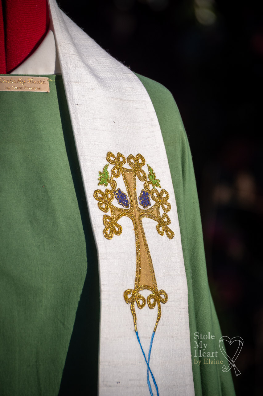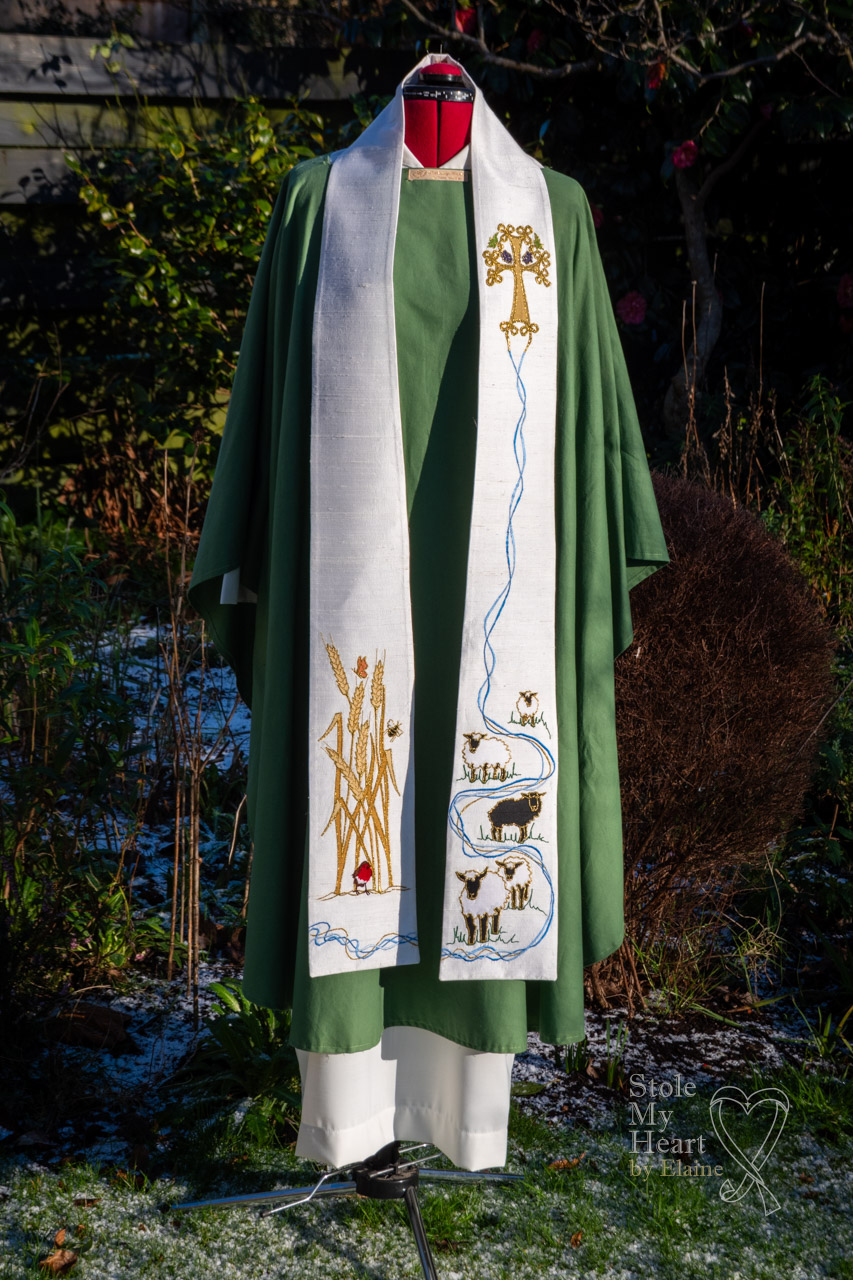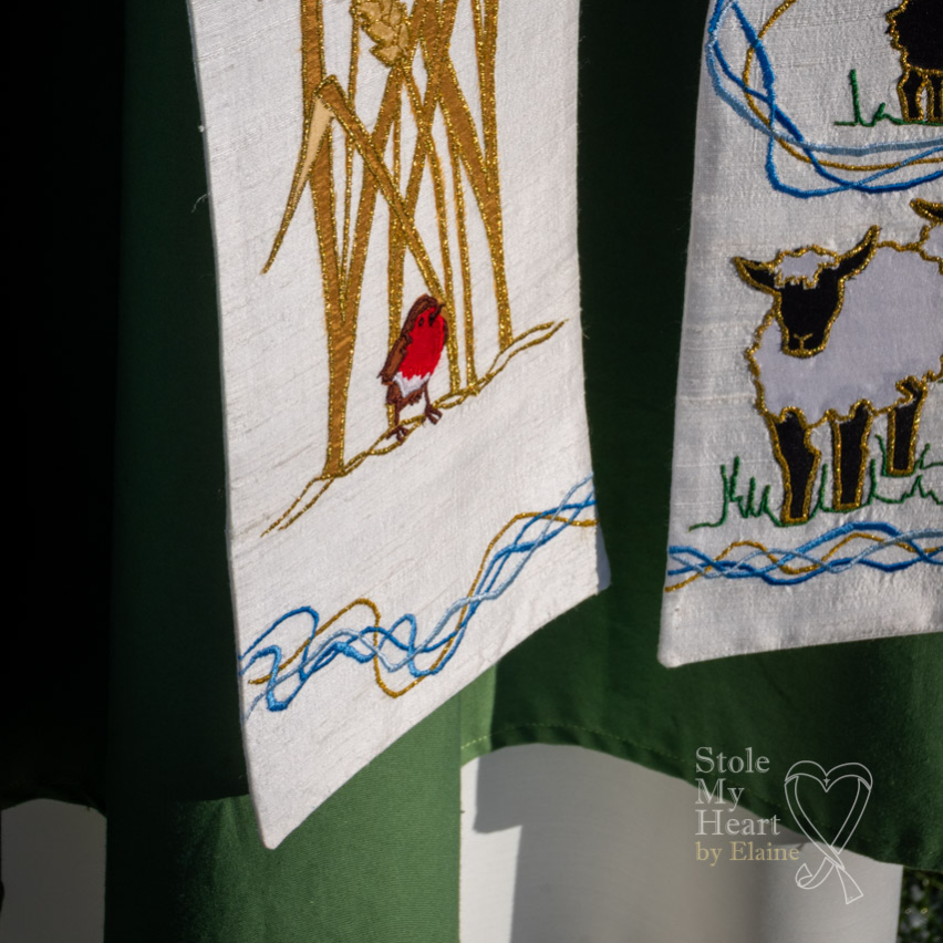 The client who commissioned this stole wanted it to reflect, on one side, their life as a shepherdess, her flock being Llanwenog sheep, a lovely ‘woolly’ sheep with a black face. The other side was a memorial to a beloved husband. I tried to created the idea of a river which would connect the two sides, by using flowing lines of blue and gold, that has its source at the Celtic ‘tree cross’ up on the left side at chest height.