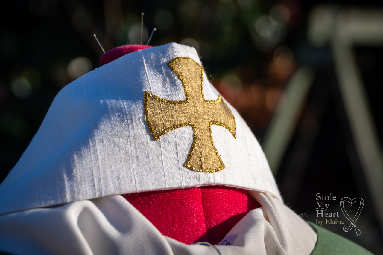 This stole was created using ivory Dupion silk, with a silk design appliqued using gold thread.