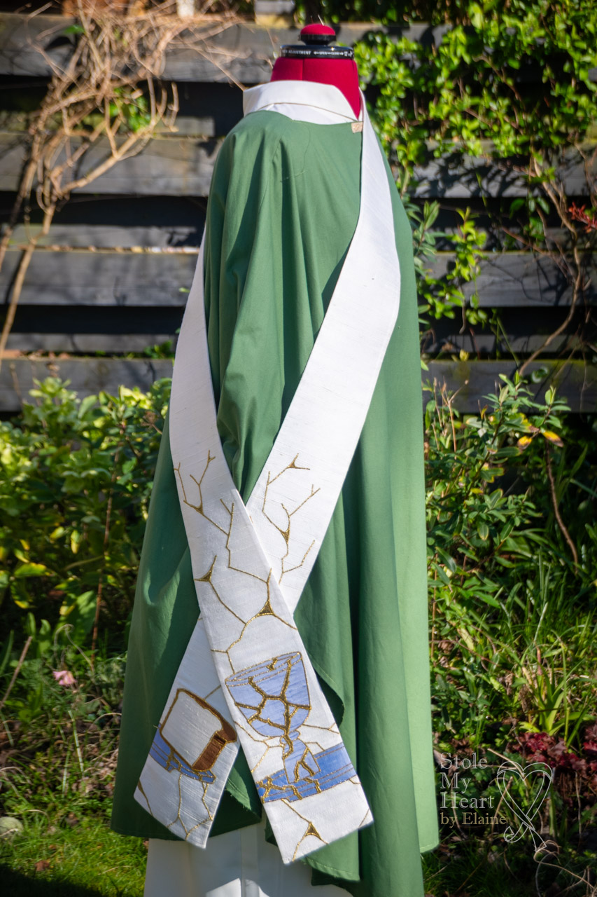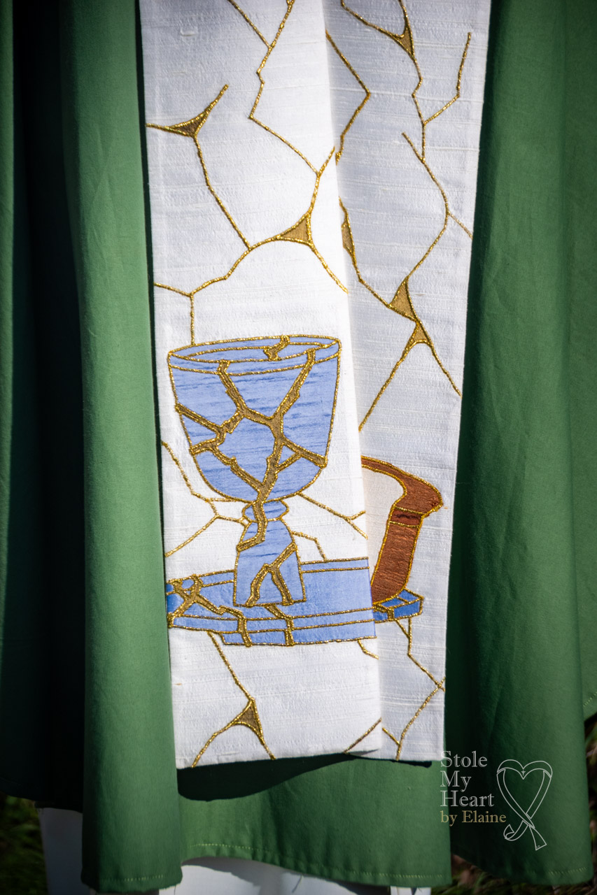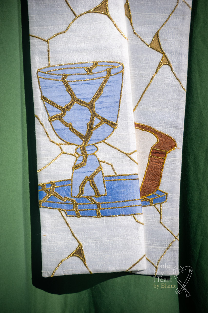 The inspiration for this stole came from Psalm 31:12 … I have faded from memory as if I were dead and have become like a piece of broken pottery…. but by using the Japanese art of Kintsugi, stitching things back together using gold, we can create something beautiful and strong again. The client is also dyslexic and has discovered through a journey of discovery that what they believed to be the worst thing about themselves is actually what God uses beautifully & they want to share this message with others, through the medium of their stole. It features a pottery chalice, paten and a loaf of bread. The client also wanted the cracks to appear on the stole itself as though it had been dropped and then fixed back together.