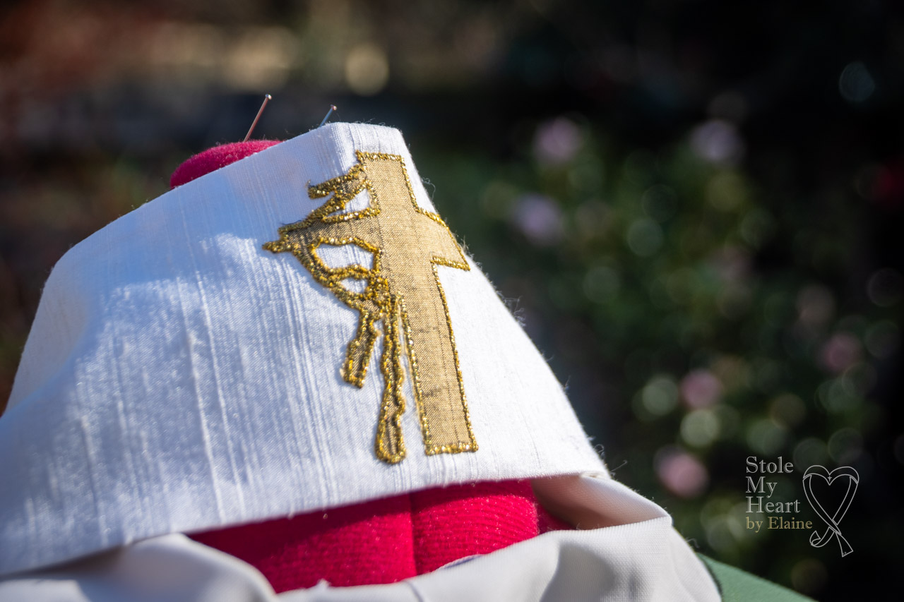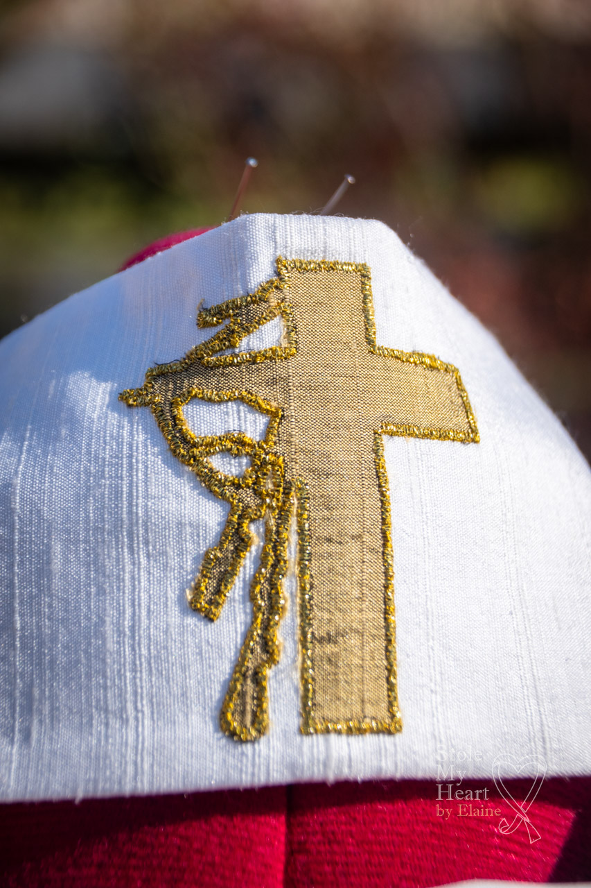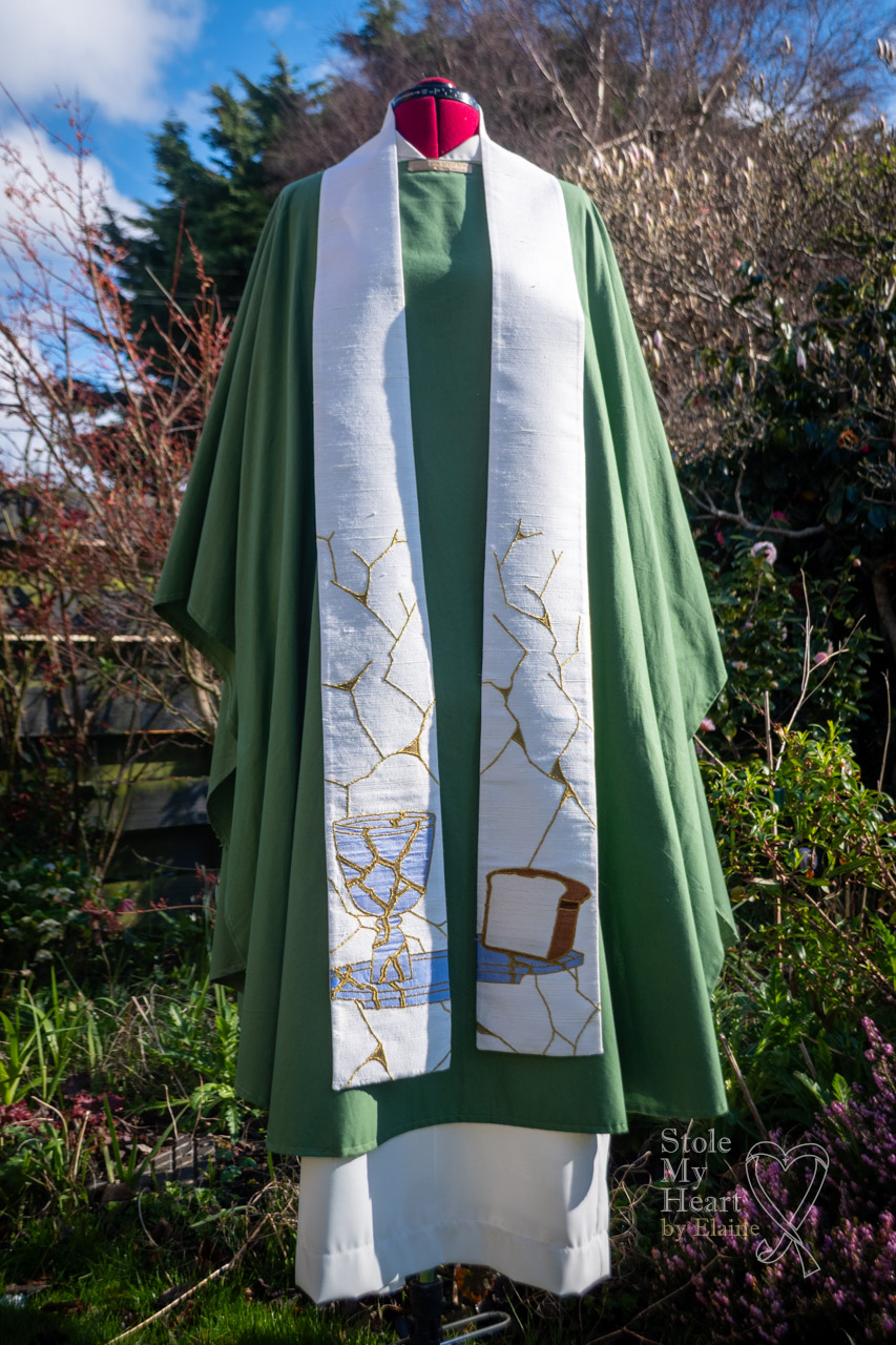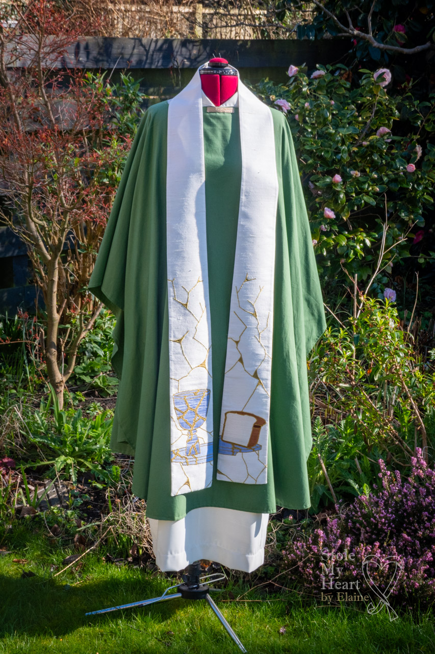 The inspiration for this stole came from Psalm 31:12 … I have faded from memory as if I were dead and have become like a piece of broken pottery…. but by using the Japanese art of Kintsugi, stitching things back together using gold, we can create something beautiful and strong again. The client is also dyslexic and has discovered through a journey of discovery that what they believed to be the worst thing about themselves is actually what God uses beautifully & they want to share this message with others, through the medium of their stole. It features a pottery chalice, paten and a loaf of bread. The client also wanted the cracks to appear on the stole itself as though it had been dropped and then fixed back together.