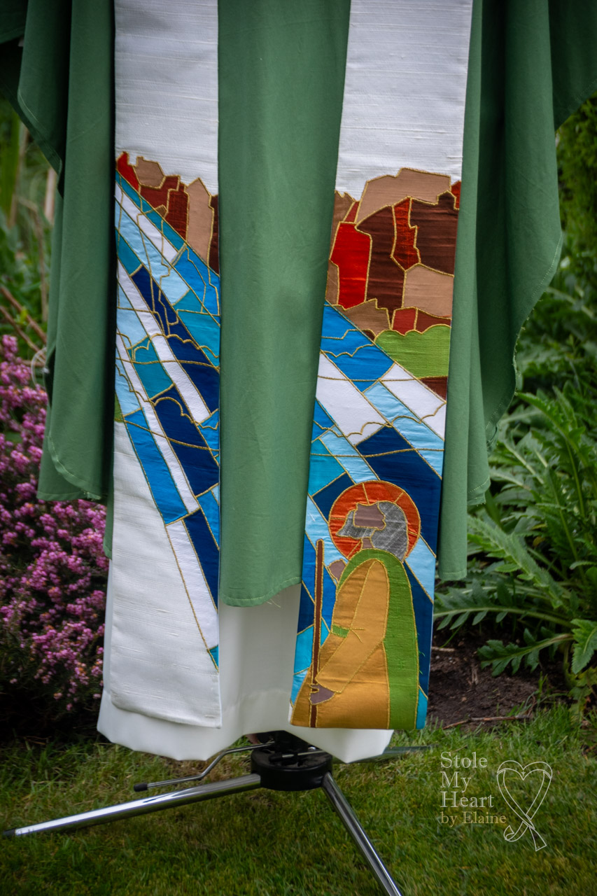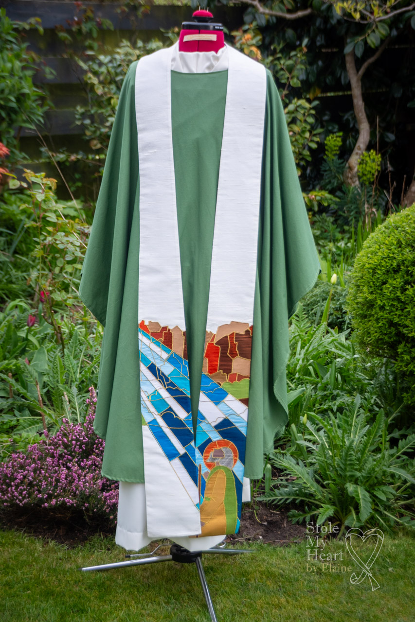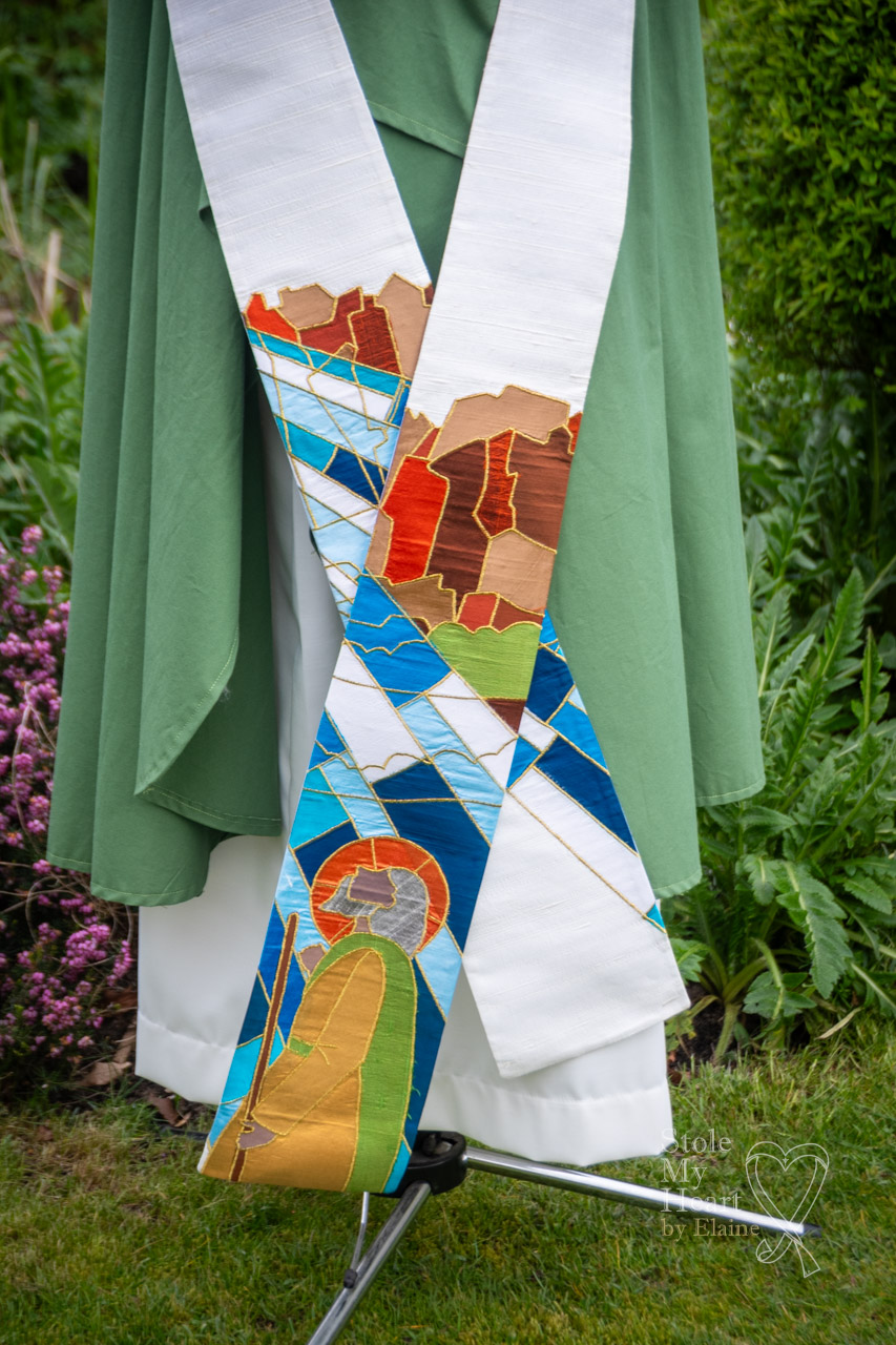 This stole was made using ivory Dupion silk with coloured silk appliqued pieces, stitched down with gold thread. This is an example of a ‘scenic’ design.