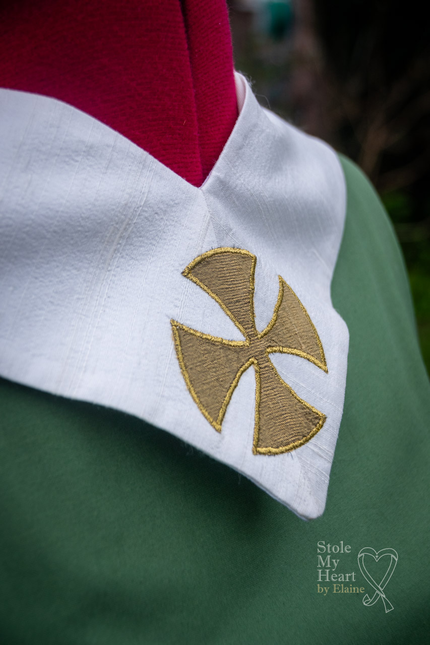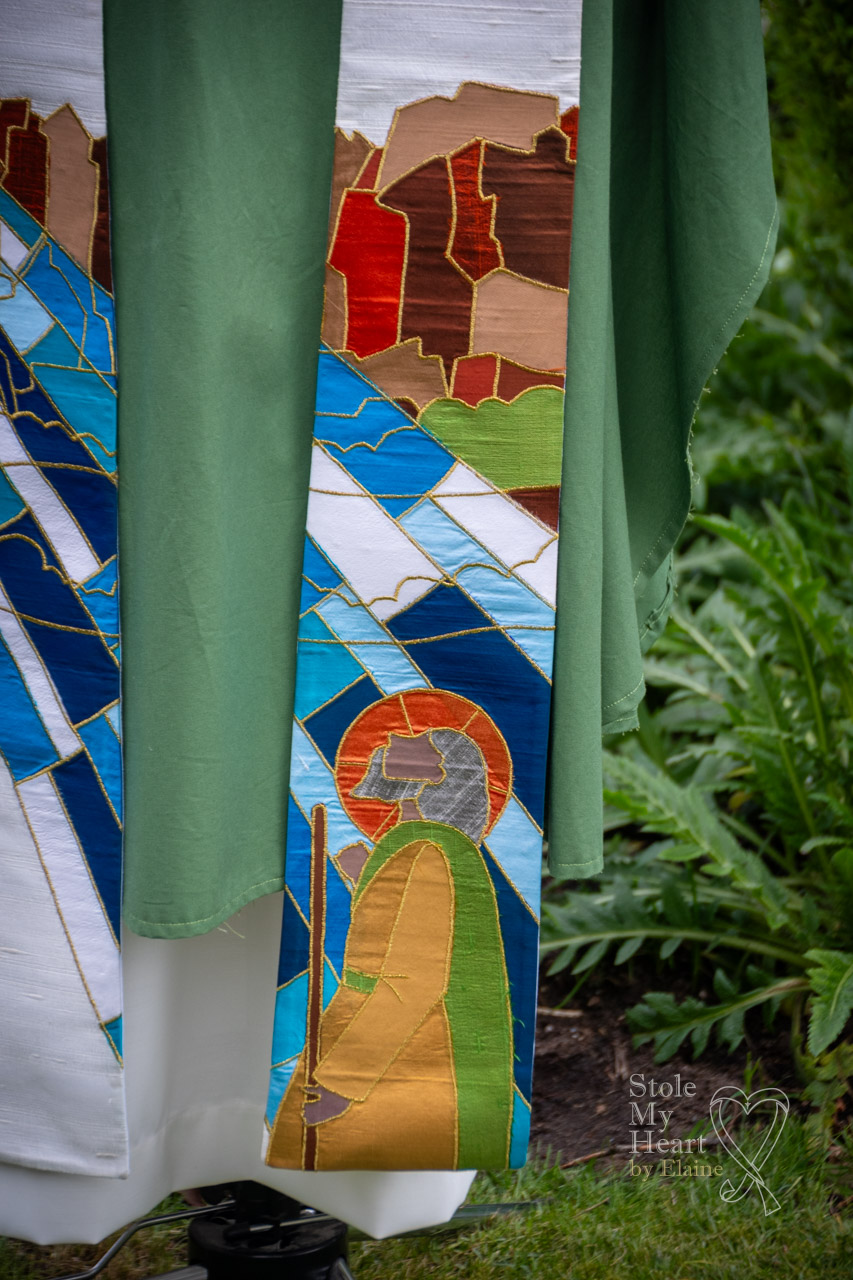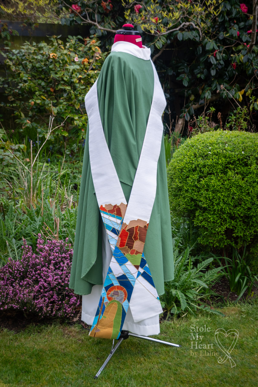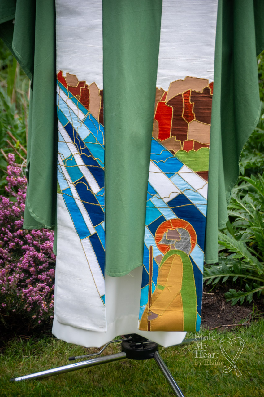 This stole was made using ivory Dupion silk with coloured silk appliqued pieces, stitched down with gold thread. This is an example of a ‘scenic’ design.