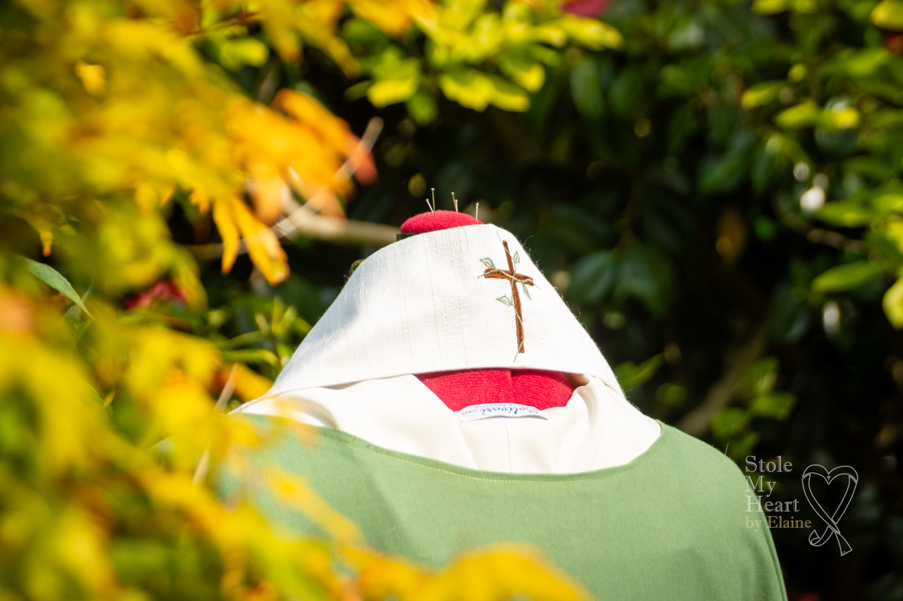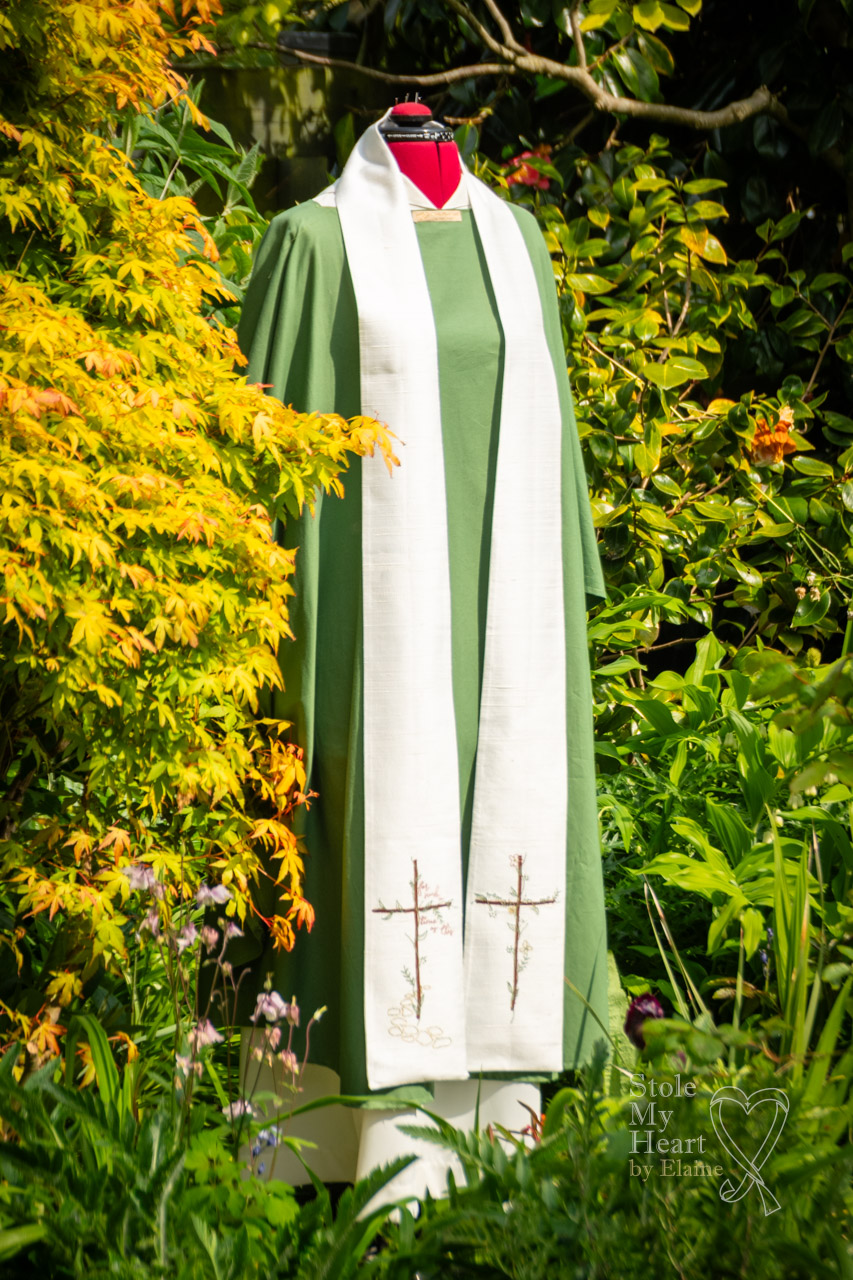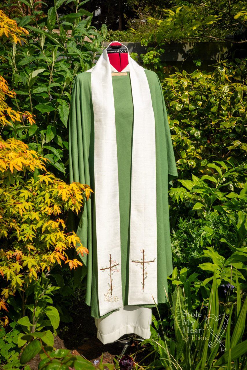 This was a very challenging stole because of the intricacy of the design and the fact that it contained lettering, always tricky using a traditional sewing machine. It has a body of ivory Dupion silk with appliques and machine embroidery details.