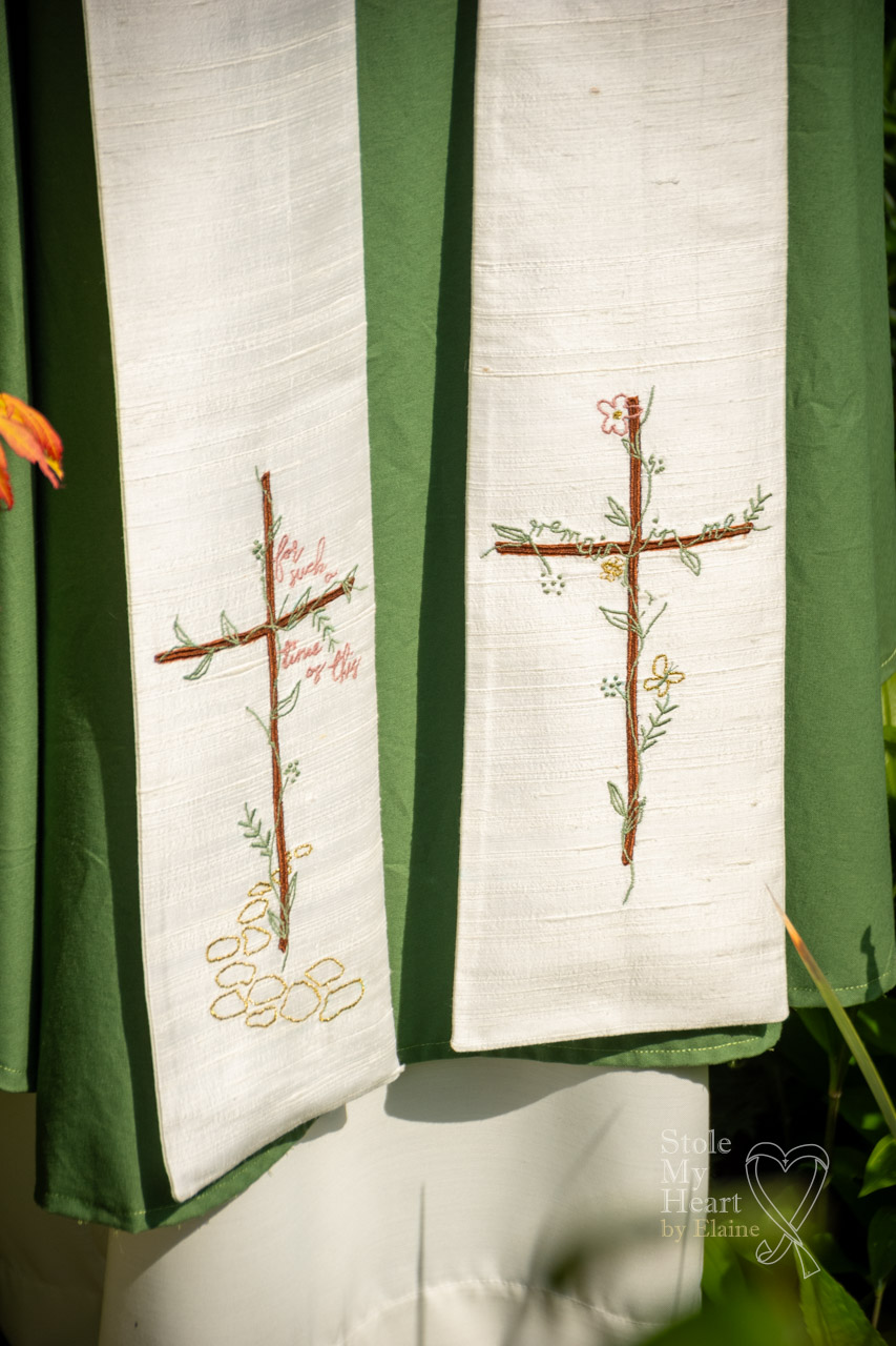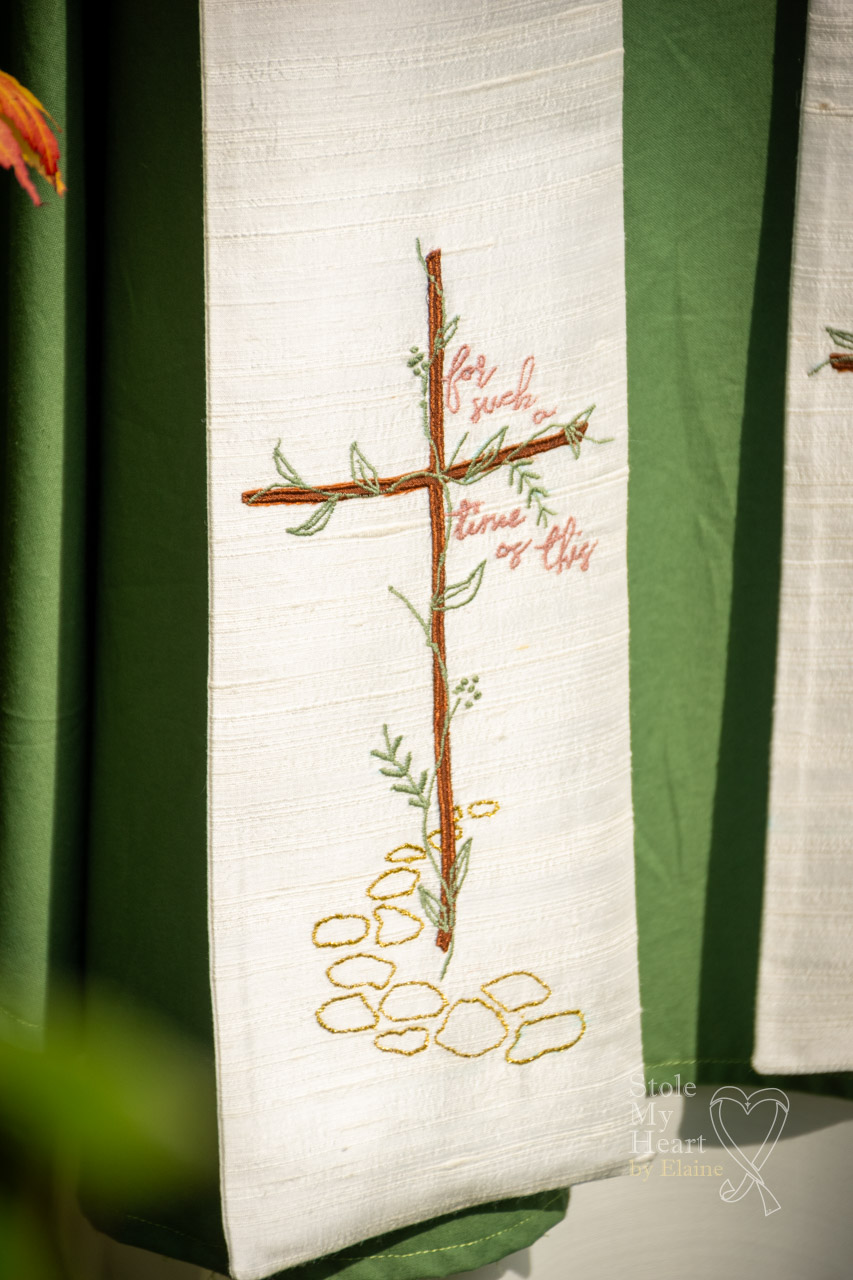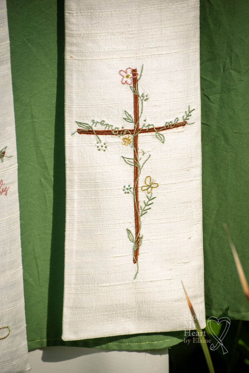 The client commissioning this stole knew exactly what they wanted on their stole. They provided me with the design created by a friend and already sketched out. They wanted me to replicate it as closely as possible. The bee, butterfly and flower represented their children and the two phrases ‘for such a time as this’ and ‘remain in me’ were of particular significance.