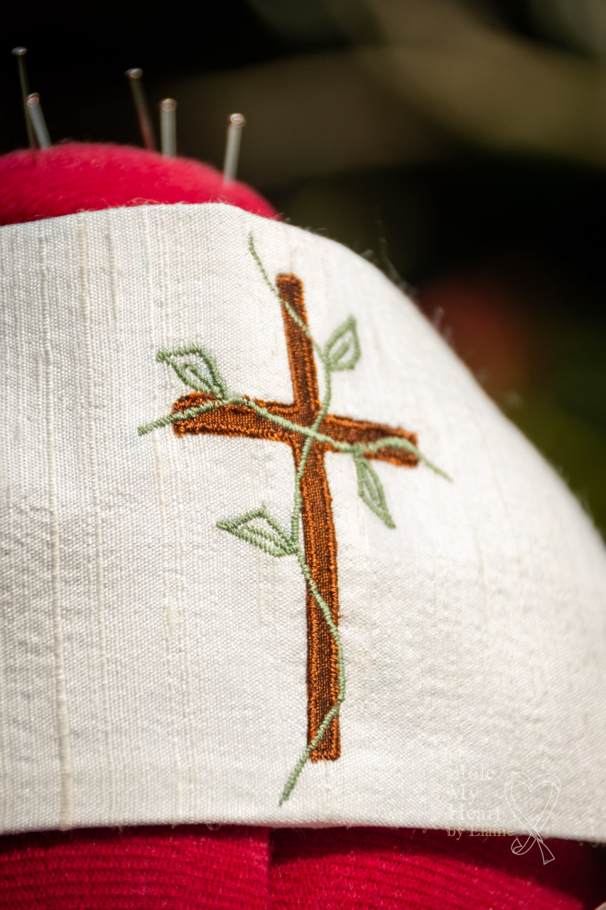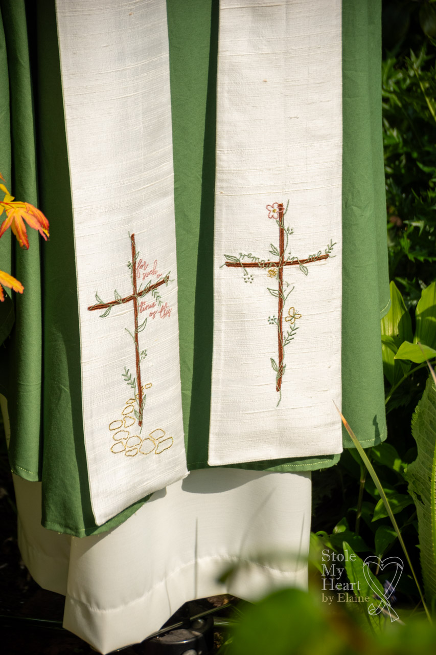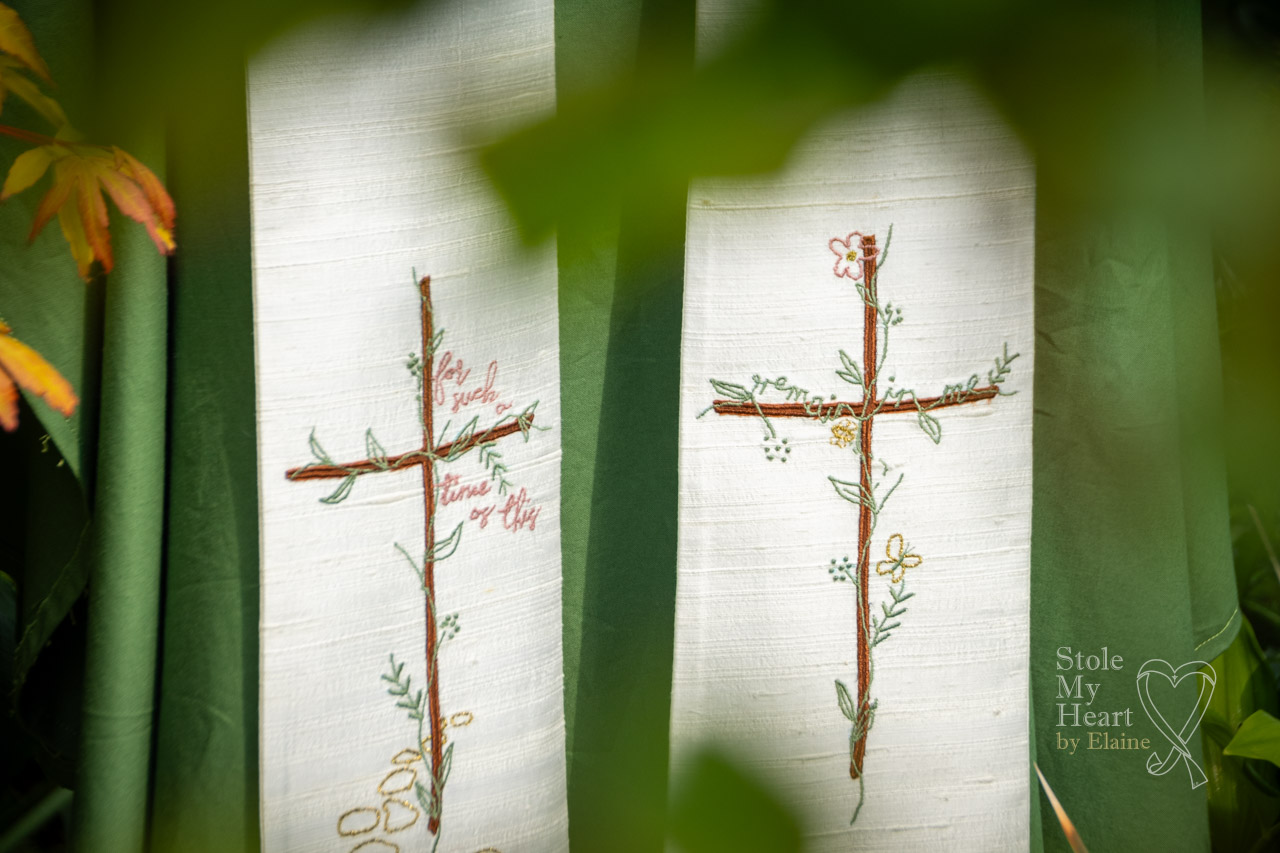 The client commissioning this stole knew exactly what they wanted on their stole. They provided me with the design created by a friend and already sketched out. They wanted me to replicate it as closely as possible. The bee, butterfly and flower represented their children and the two phrases ‘for such a time as this’ and ‘remain in me’ were of particular significance.