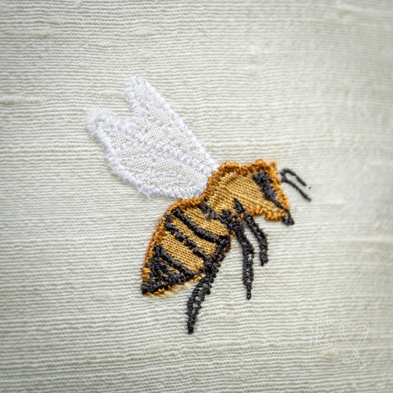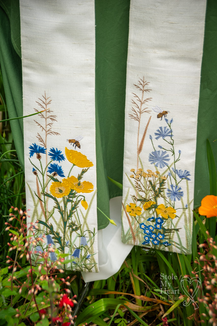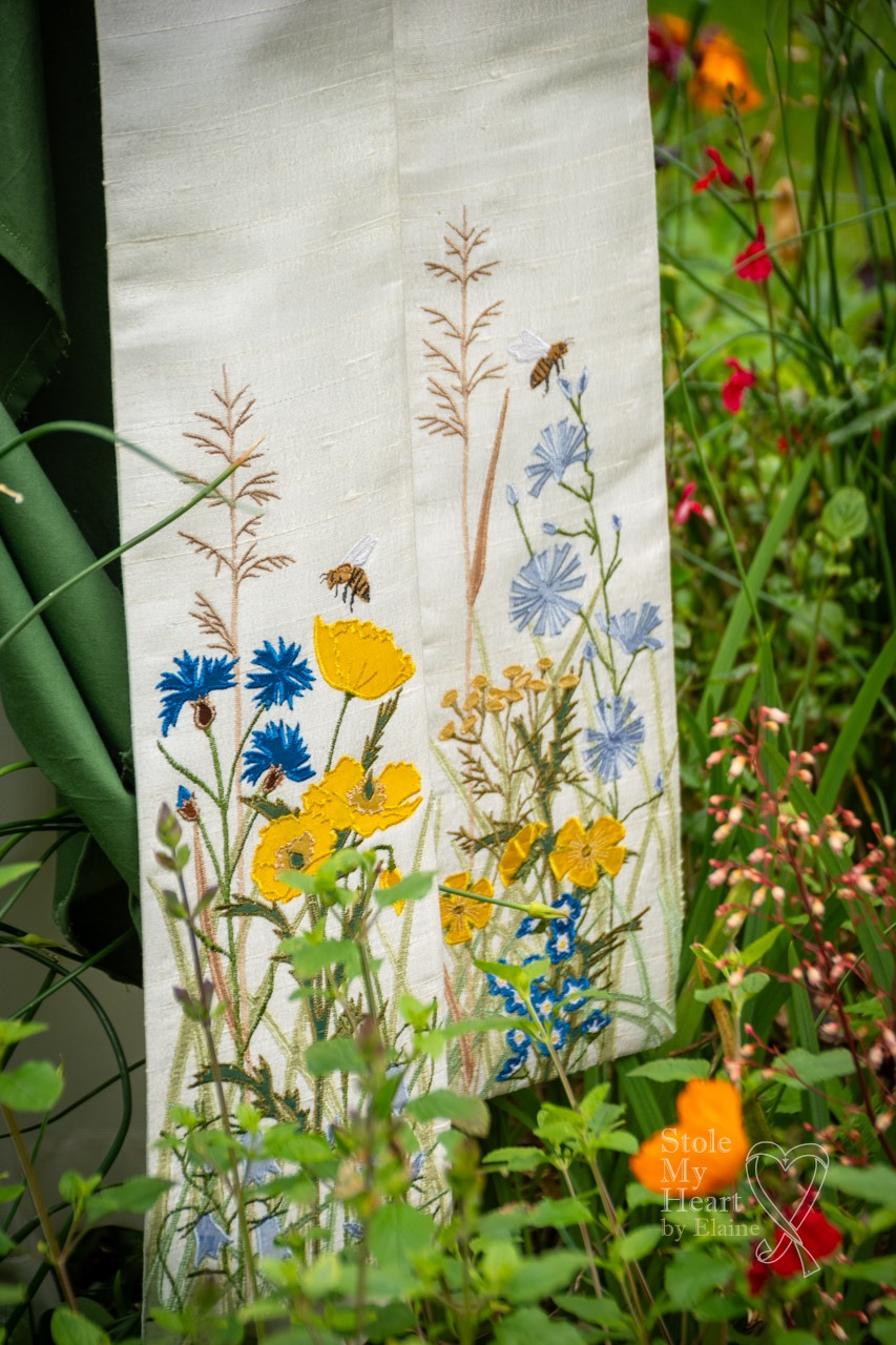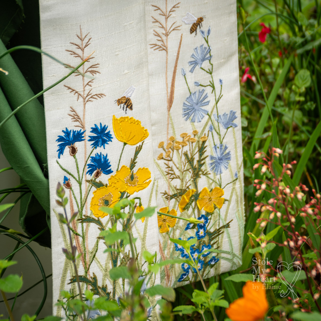 The brief for this commission was to have wild flowers growing up from the bottom, to keep the colours as natural as possible and to include three honey bees, one for each of their children. Technically this turned out to be more difficult than I imagined as I had to work out which layer of leaves, grasses or flowers came in which order and then stitching the tiny spaces sometimes created by the overlapping. I have to admit to being rather pleased with the finished result though. On the back neck seam is one further honey bee, a poignant reminder for the client.