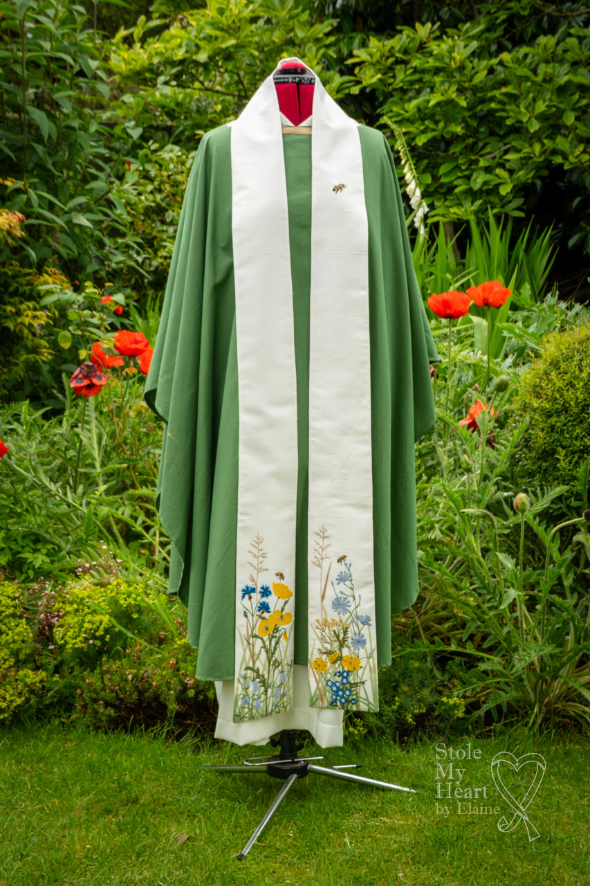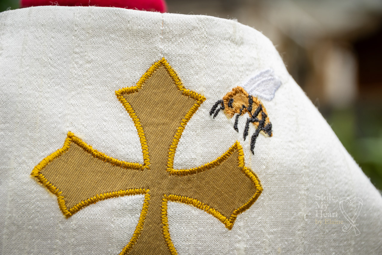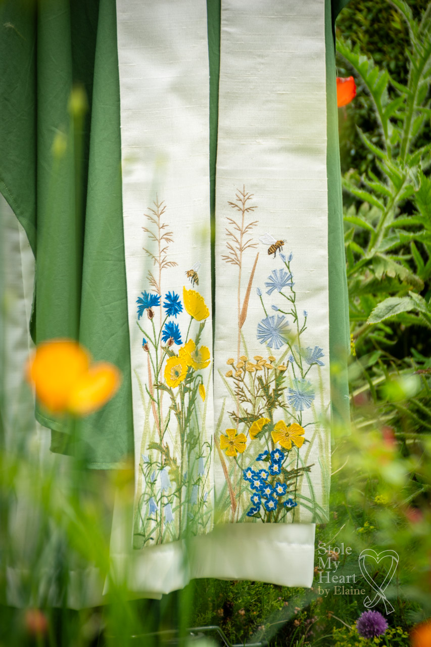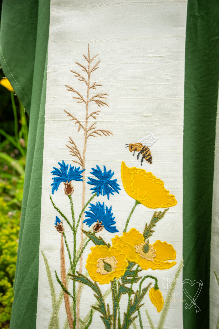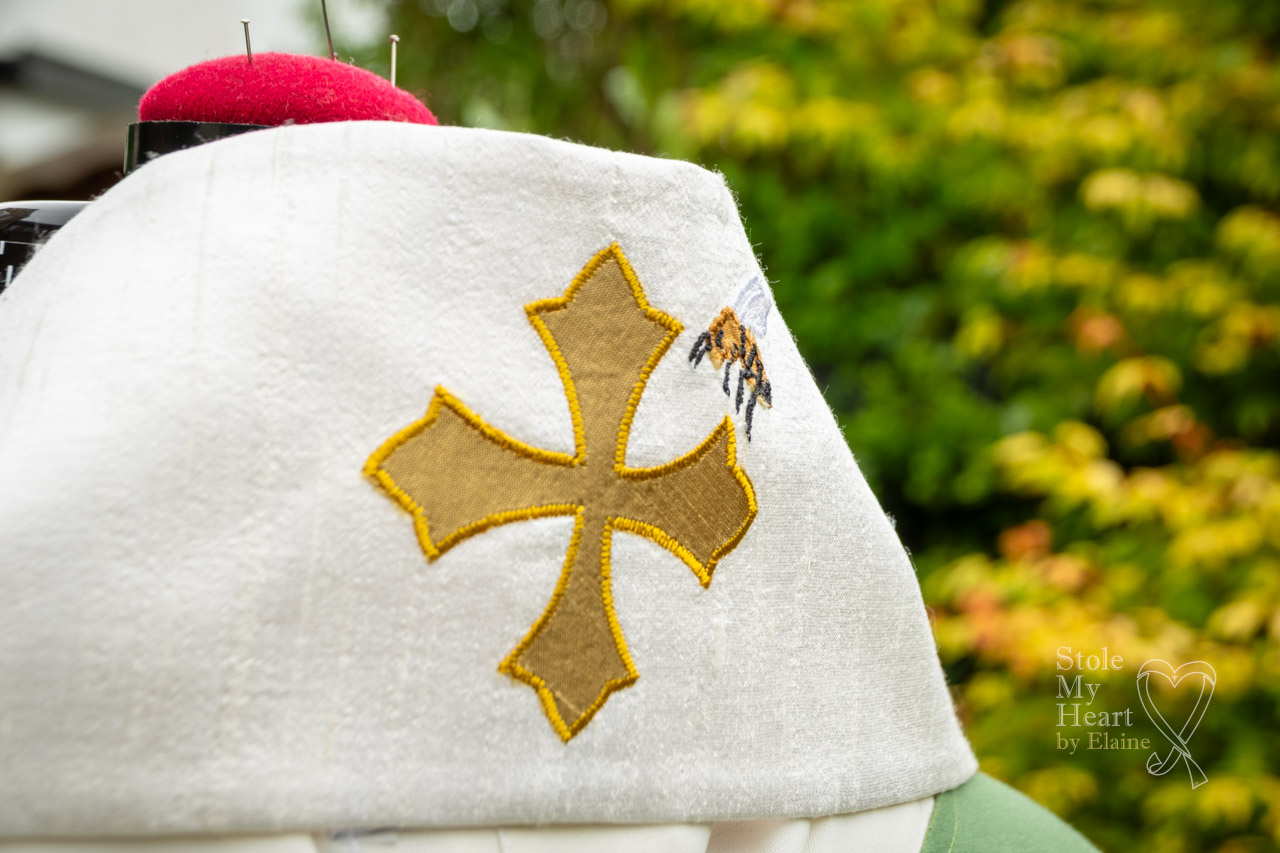 The brief for this commission was to have wild flowers growing up from the bottom, to keep the colours as natural as possible and to include three honey bees, one for each of their children. Technically this turned out to be more difficult than I imagined as I had to work out which layer of leaves, grasses or flowers came in which order and then stitching the tiny spaces sometimes created by the overlapping. I have to admit to being rather pleased with the finished result though. On the back neck seam is one further honey bee, a poignant reminder for the client.