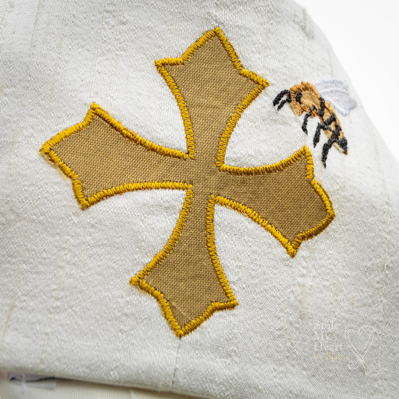 The stole is created using ivory Dupion silk with applique silk pieces and finished with machine embroidery.