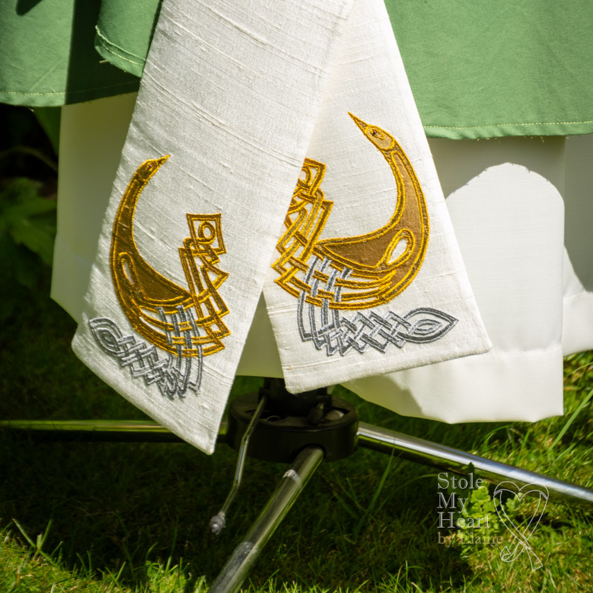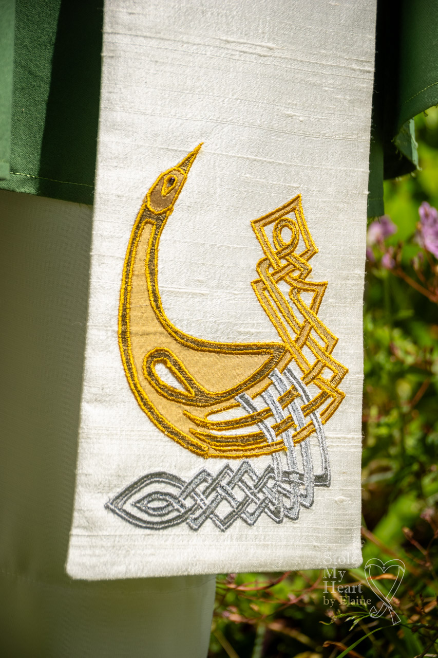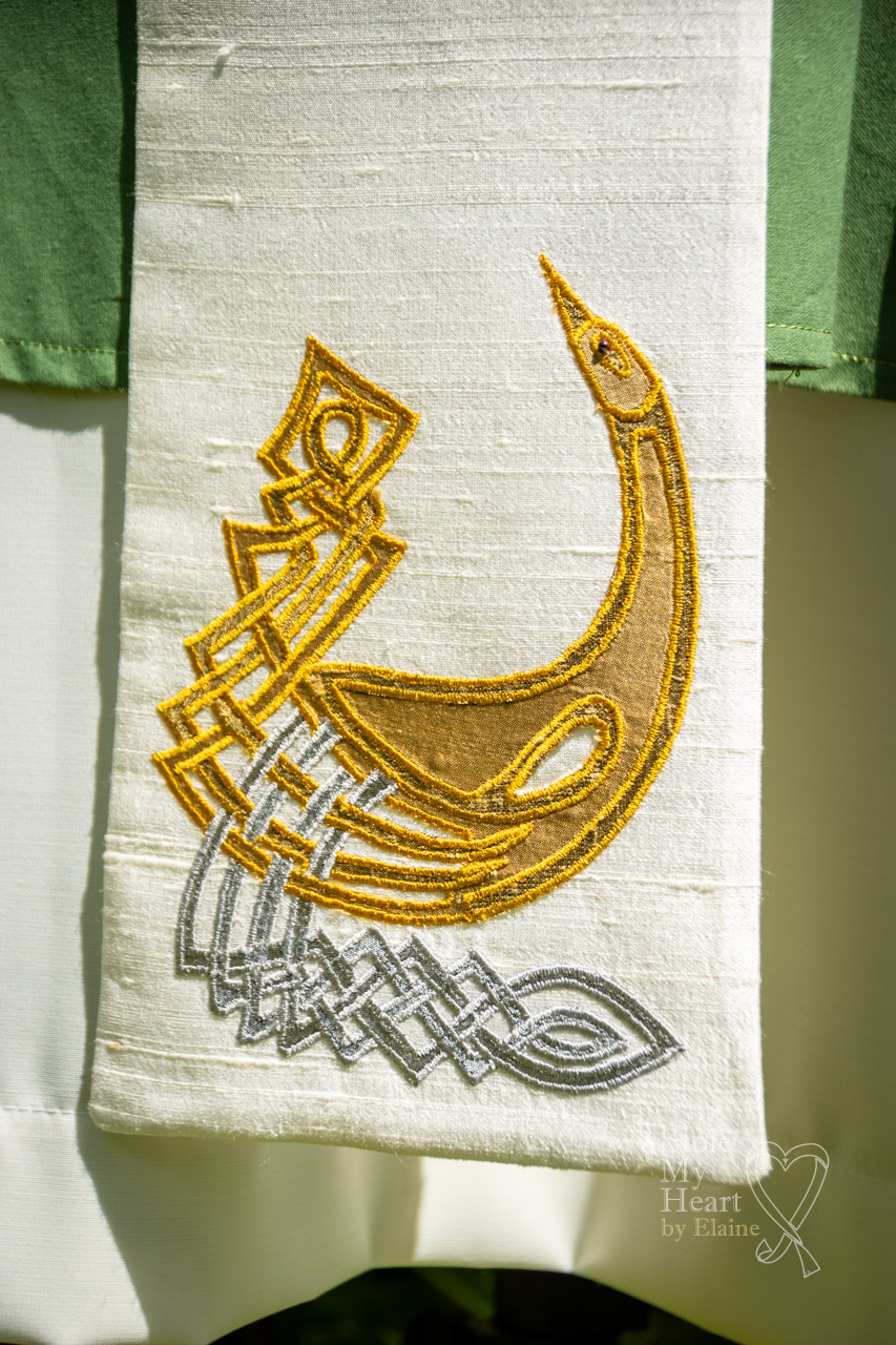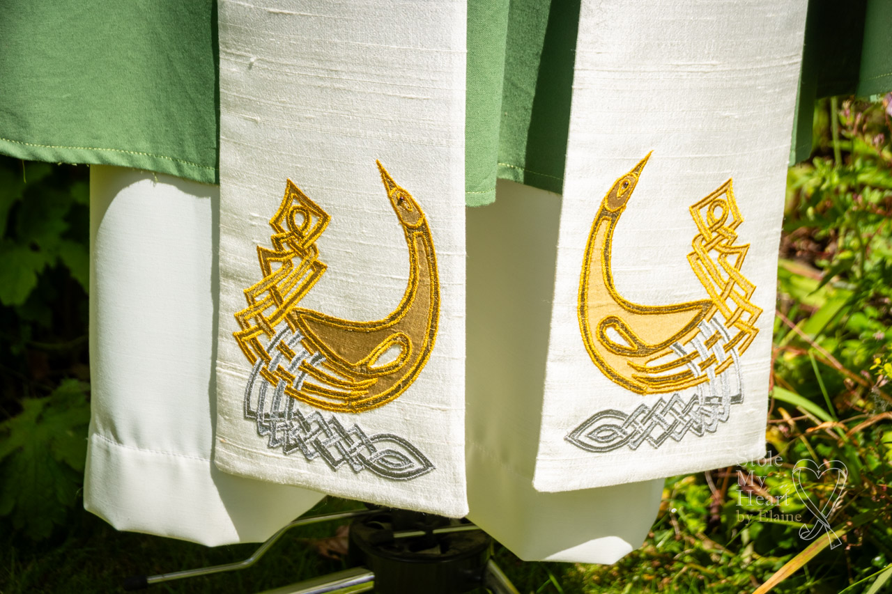 The design symbol for this commission was new to me. It shows the Holy Spirit depicted as a wild goose. This is an ancient Celtic symbol where the Holy Spirit is not a dove but a wild goose. The meaning behind this is apparently the Celts saw how the Holy Spirit moves in an unexpected fashion, having a tendency to disrupt and surprise, similar to the actions of a wild goose. I loved the challenge of working out how the Celtic design interwove.