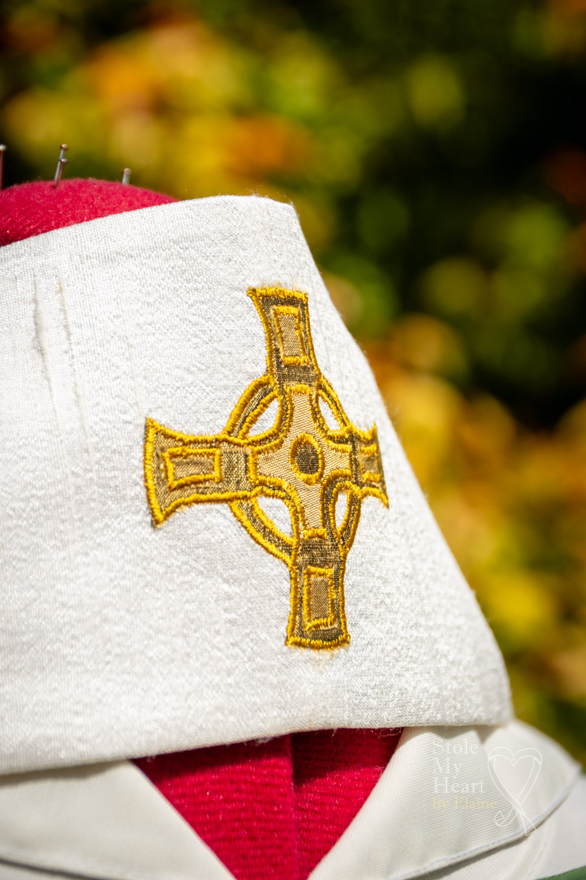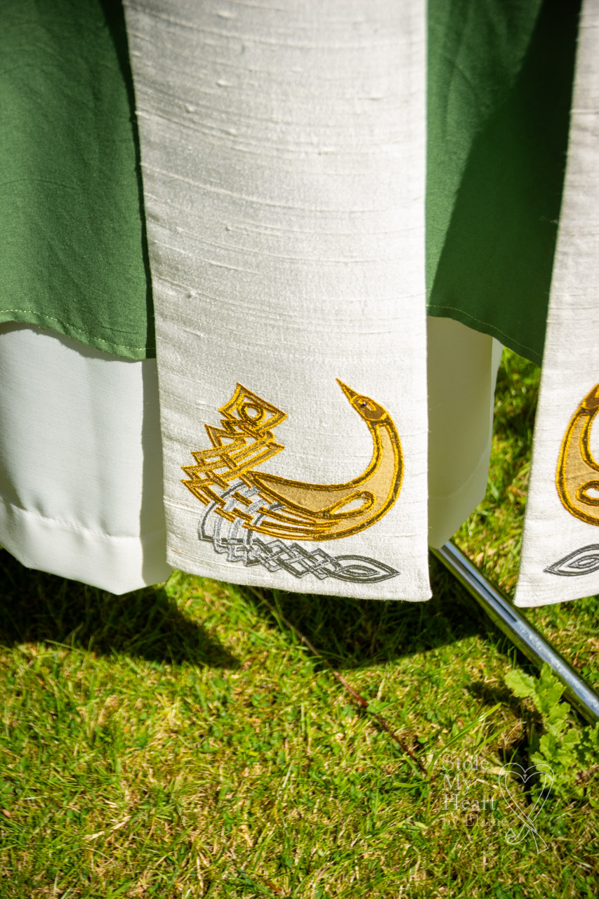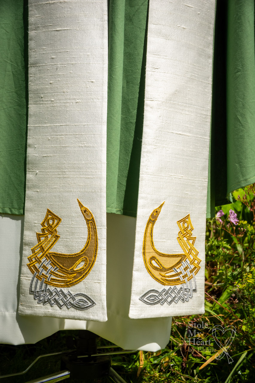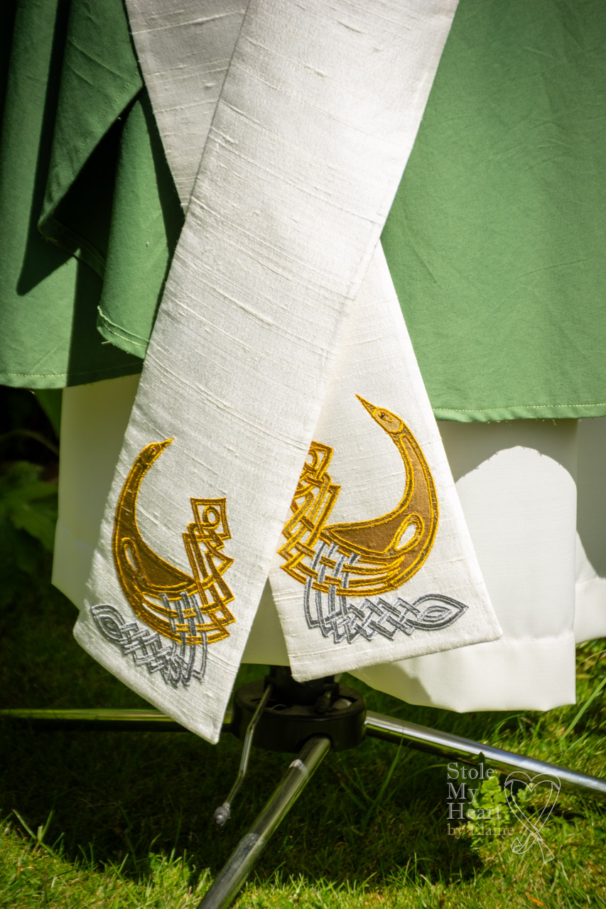 The design symbol for this commission was new to me. It shows the Holy Spirit depicted as a wild goose. This is an ancient Celtic symbol where the Holy Spirit is not a dove but a wild goose. The meaning behind this is apparently the Celts saw how the Holy Spirit moves in an unexpected fashion, having a tendency to disrupt and surprise, similar to the actions of a wild goose. I loved the challenge of working out how the Celtic design interwove.