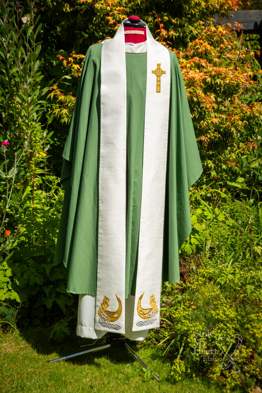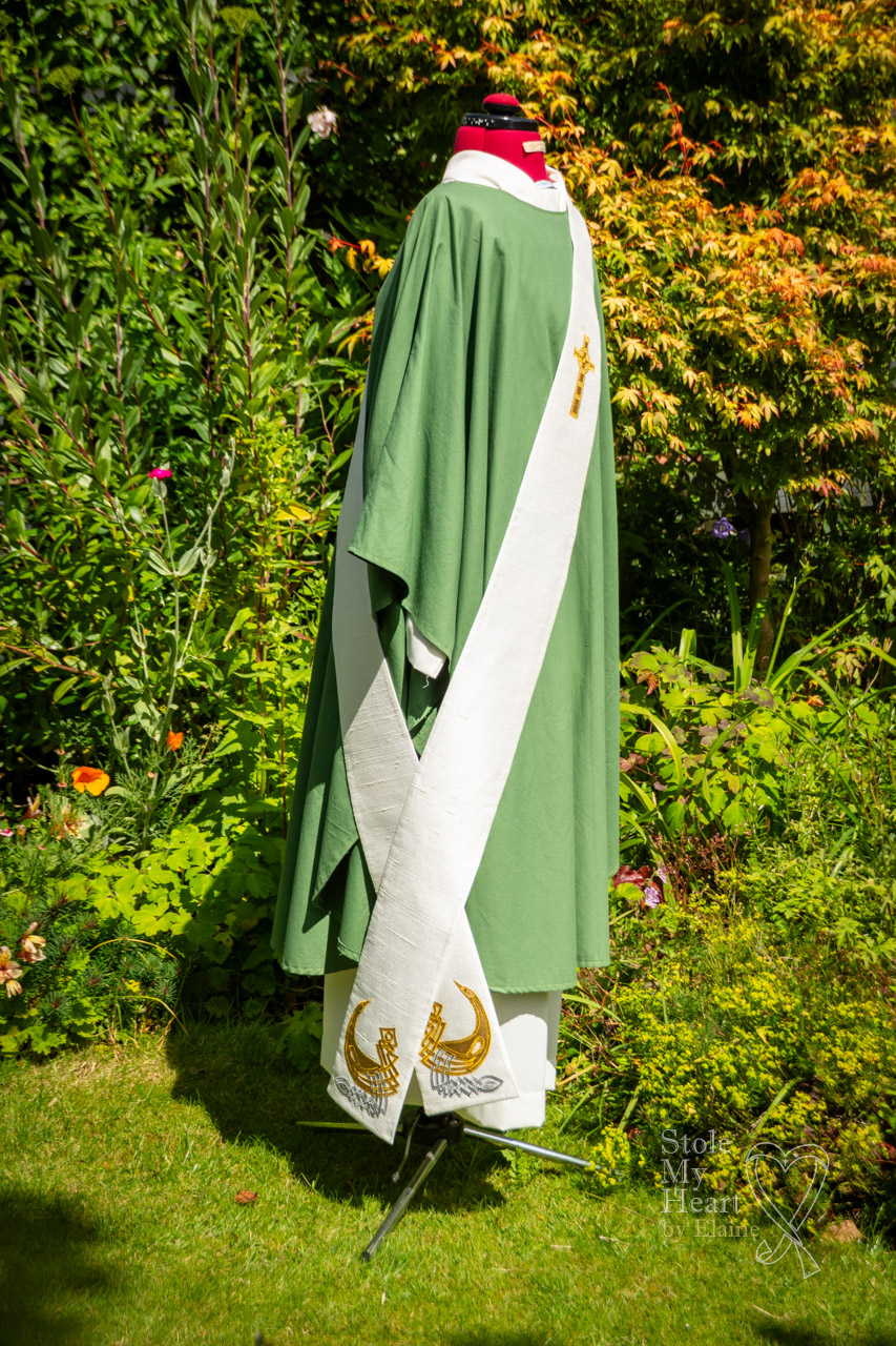 The stole was worked using gold and silver silks appliqued on to an ivory silk Dupion background. This is an example of a ‘symbol’ design.