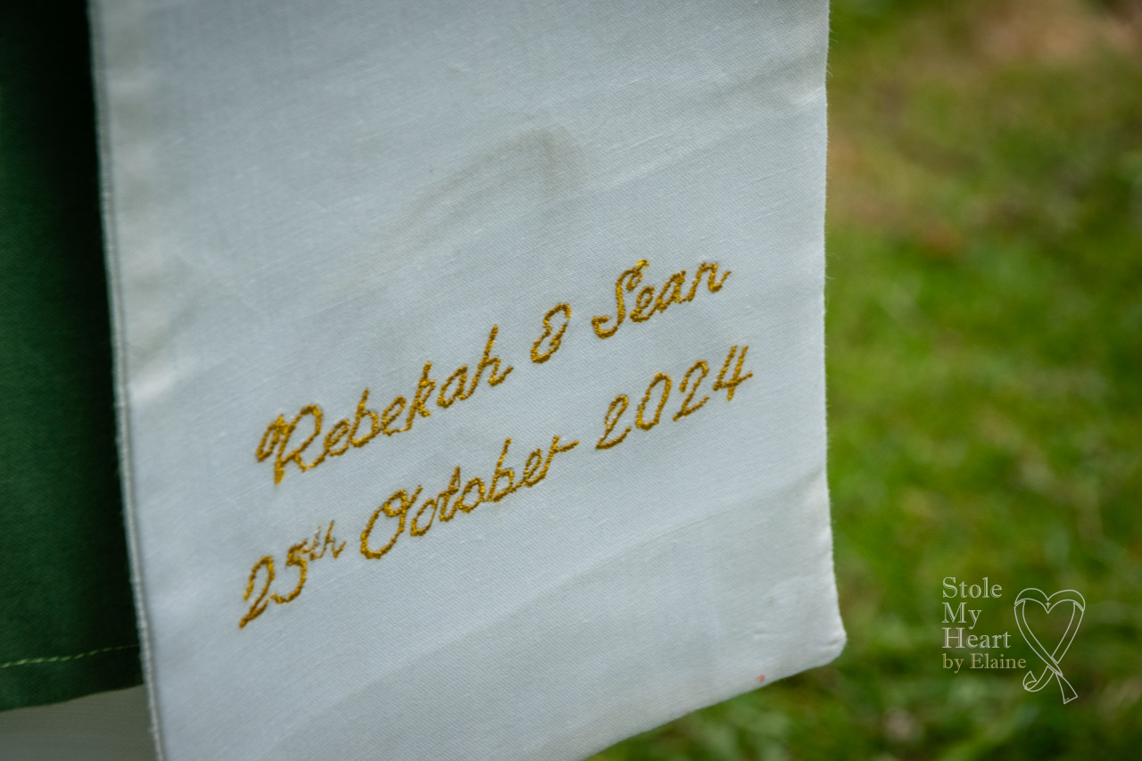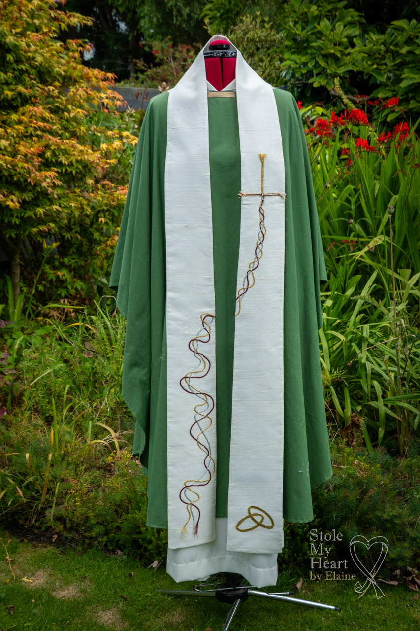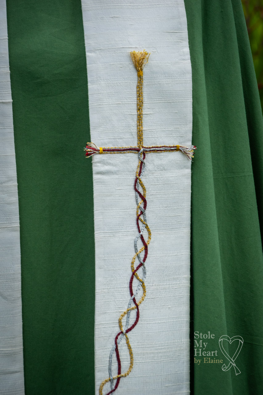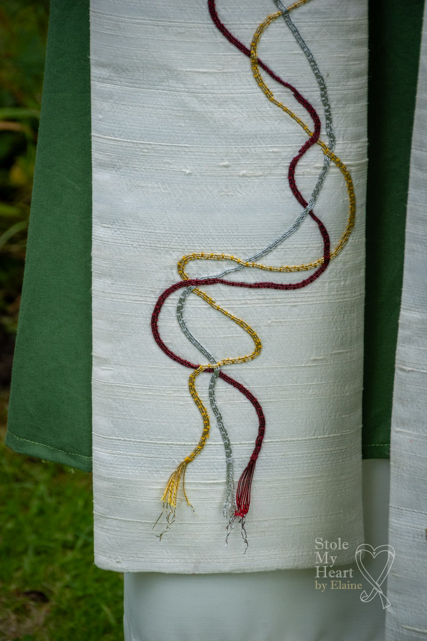 This stole is a little bit different from the way I usually work but once I had talked to the client about their ideas for the stole, which is to be used at the wedding of two very dear friends, this way of creating a design seemed an obvious way to go. I was given the quote from Ecclesiastes 4: 9-12 ‘A cord of three strands is not quickly broken….’, the client wanted a design that flowed down the stole from a cross on the left at chest height. The colours that were to be used at the wedding were gold, burgundy and silver and I was to keep to these colours. The idea that the cross could be made from couched treads came to me and then developed in to the whole design being formed from these three ‘cords’ representing God, the bride and the groom.