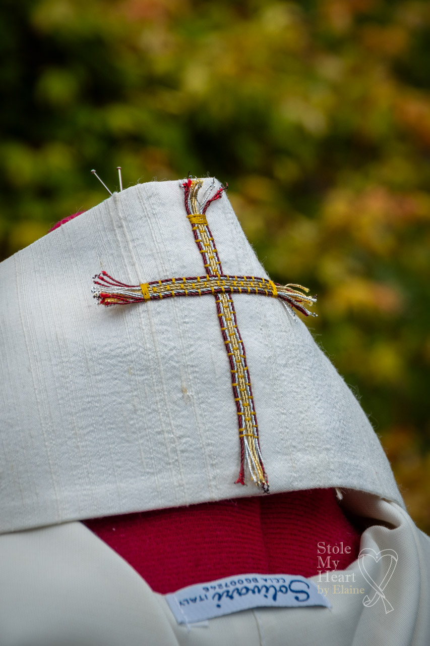 The stole was created using ivory Dupion silk with hand couched 3ply twist thread in gold, silver & burgundy.